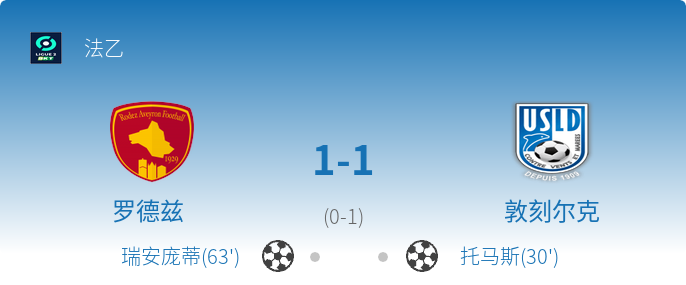 法乙第15轮:罗德兹1-1战平敦刻尔克