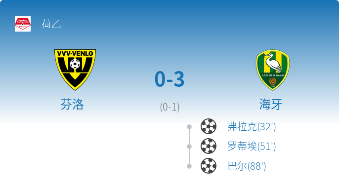 荷乙第18轮:海牙客场3-0完胜芬洛