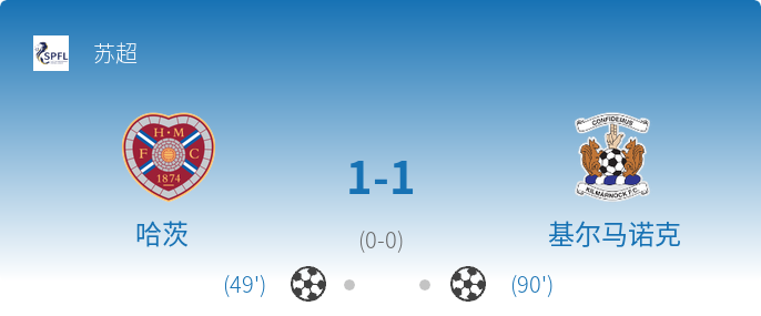 比赛概述在2025年12月4日凌晨进行的苏超第15轮比赛中,哈茨坐镇主场迎战基尔马诺克。比赛一度由哈茨领先,但基尔马诺克在伤停补时阶段打入绝平进球,最终双方1-1战平,各取一分。