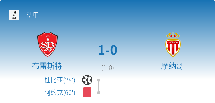 比赛概述北京时间2025年12月6日,法甲第15轮,摩纳哥坐镇主场迎战布雷斯特。全场比赛,布雷斯特凭借杜比亚在上半场的头球破门,以1-0的比分客场战胜摩纳哥。尽管布雷斯特球员阿约克在第60分钟被红牌罚下,但摩纳哥未能利用人数优势扳平比分,最终主场告负。
