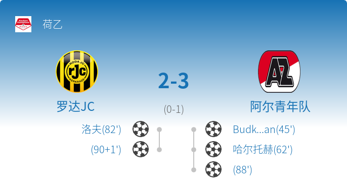 阿尔青年队主场3-2险胜罗达JC,荷乙激战告捷