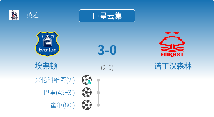 关键事件- 2分钟:诺丁汉森林球员萨沃纳吃到黄牌,随后米伦科维奇的乌龙球帮助埃弗顿取得1-0领先。