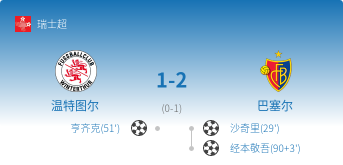 比赛概述北京时间2025年12月7日晚,瑞士超级联赛第16轮,温特图尔坐镇主场迎战巴塞尔。比赛过程一波三折,巴塞尔在第29分钟率先破门,温特图尔则在第51分钟通过亨齐克的进球扳平比分。就在比赛即将以平局收场之际,巴塞尔在补时第3分钟攻入制胜球,最终以2-1绝杀对手,客场带走三分。