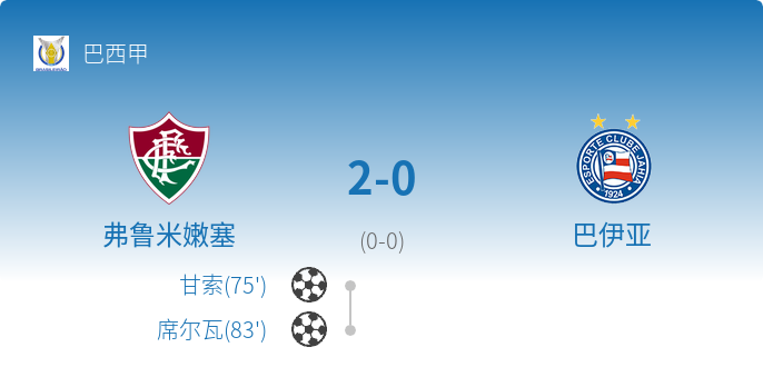北京时间2025年12月8日,巴西足球甲级联赛第38轮收官战,弗鲁米嫩塞坐镇主场迎战巴伊亚。上半场双方互有攻守但均无建树,场面略显胶着。下半场风云突变,弗鲁米嫩塞在比赛后段发力,凭借75分钟的进球和席尔瓦83分钟的头槌破门,以2-0的比分完胜对手,用一场胜利为本赛季主场赛事画上句号。