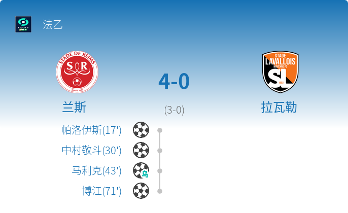 - 43' 拉瓦勒球员马利克不慎自摆乌龙,兰斯笑纳进球。