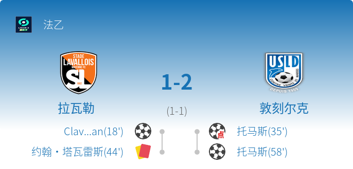 - 35' 敦刻尔克队获得点球,托马斯主罚命中,扳平比分至1-1。