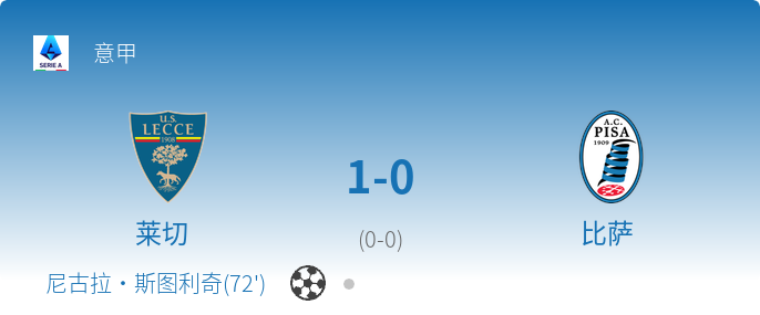比赛概述2025年12月13日,意甲联赛第15轮,莱切在主场迎战比萨。整场比赛双方拼抢激烈,莱切凭借第72分钟的进球奠定胜局,最终以1-0击败比萨,在积分榜上收获关键三分。