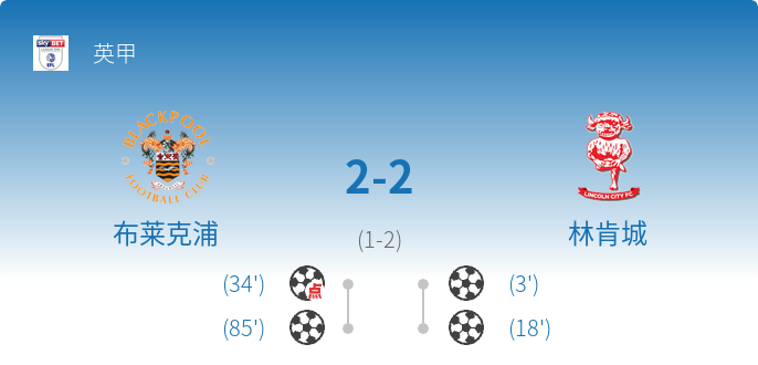 英甲第20轮:布莱克浦85分钟绝平林肯城,2-2战平