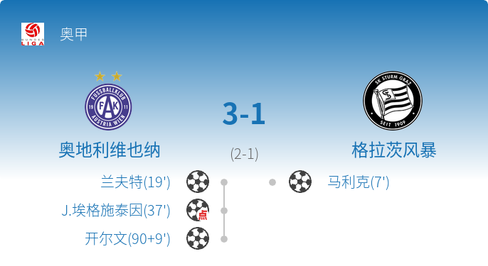 • 90+9' 奥地利维也纳队进球,锁定胜局3-1。