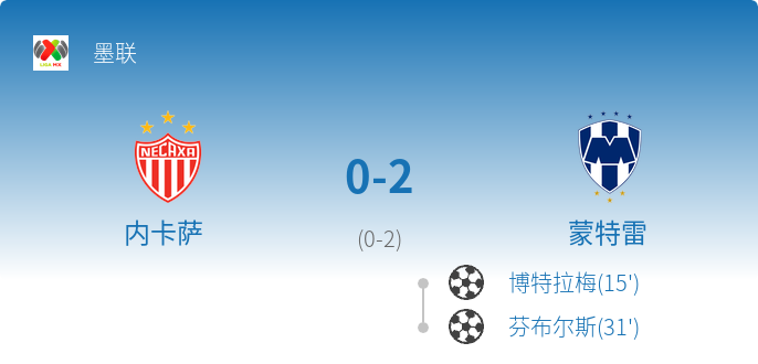 比赛概述在2026年1月14日进行的墨西哥足球联赛第2轮比赛中,内卡萨坐镇主场迎战蒙特雷。蒙特雷凭借上半场第15分钟和第31分钟的进球早早确立优势,下半场双方均未能改写比分,最终蒙特雷客场2-0击败内卡萨,取得联赛开局两连胜。