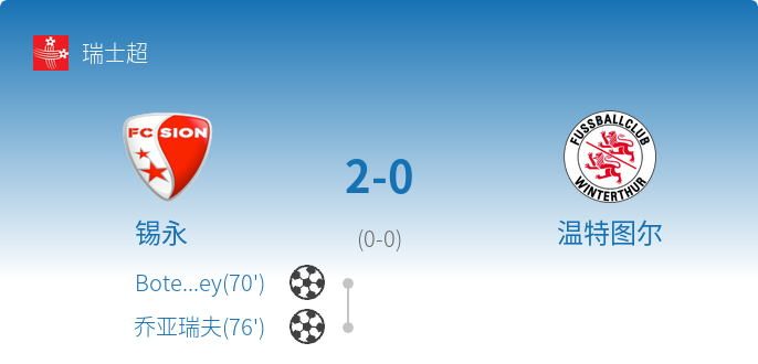 比赛概述北京时间2026年1月15日03:30,瑞士超级联赛第19轮,锡永坐镇主场迎战温特图尔。经过90分钟的激烈较量,锡永凭借下半场的两粒进球,以2-0完胜对手,全取三分。