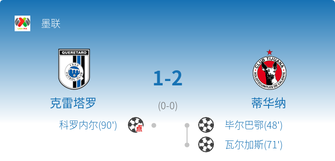 墨联第2轮:蒂华纳客场2-1击败克雷塔罗