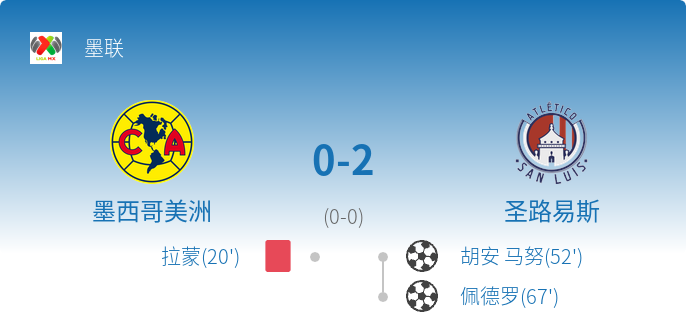 比赛概述:2026年1月15日,墨联第2轮,墨西哥美洲在主场迎战圣路易斯。比赛中,墨西哥美洲早早遭遇红牌打击,少一人作战下难以抵挡对手攻势。圣路易斯凭借上下半场的进球,最终以2-0客场取胜,全取三分。