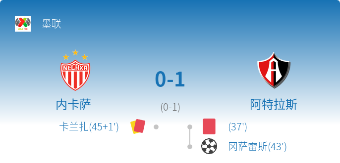 比赛概述在2026年1月18日墨西哥联赛第3轮的焦点战中,内卡萨主场对阵阿特拉斯。比赛过程紧张激烈,双方在上半场各有一名球员被红牌罚下。最终,阿特拉斯凭借第43分钟的制胜进球,以1-0的比分从客场艰难带走三分。