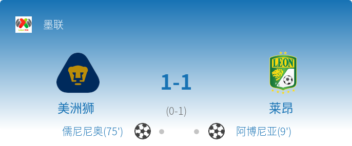 比赛概述2026年1月19日02:00,墨西哥足球联赛第3轮,美洲狮主场迎战莱昂。比赛中,莱昂由阿博尼亚率先头球破门,美洲狮则由儒尼尼奥在下半场扳平比分,最终双方1-1握手言和。