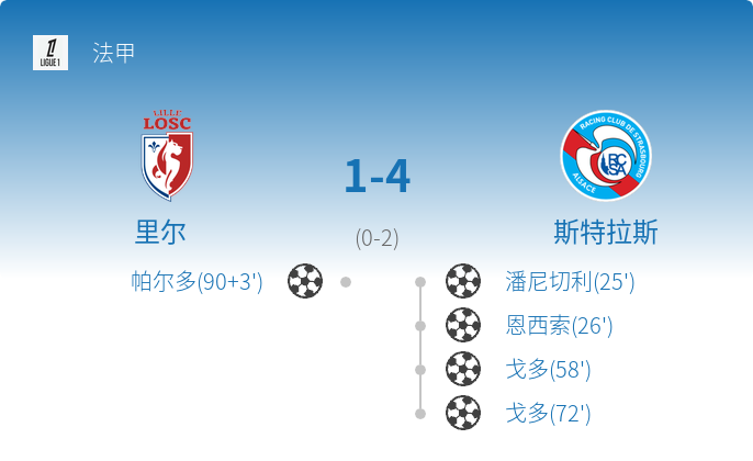 法甲第19轮:斯特拉斯客场4-1大胜里尔,豪取三分